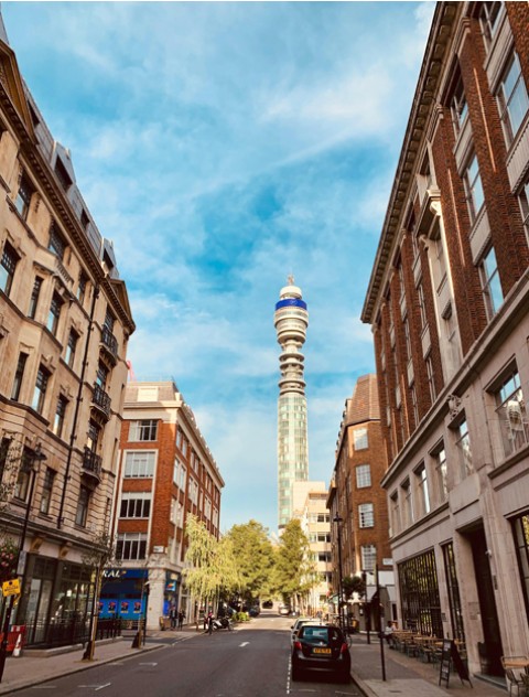 Fitzrovia’s higgledy-piggledyroofs, chimneys and narrow streets are spread out below. Our hedge-borders line the central reservation of Euston Rd, the far side of Tottenham Court Road, the closest edge of Oxford Street and the wind turbines dotted down the middle of Portland Place and into Regent Street.